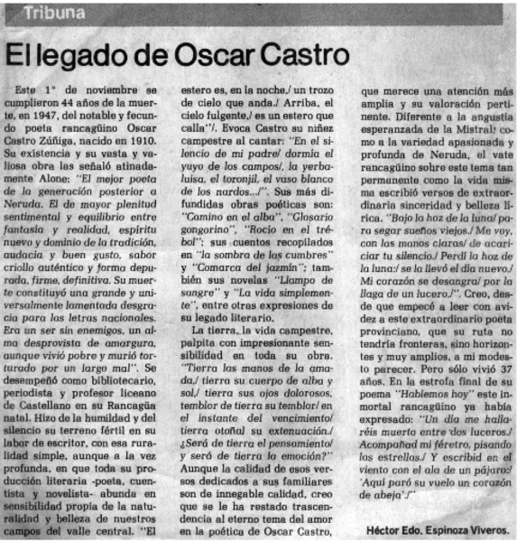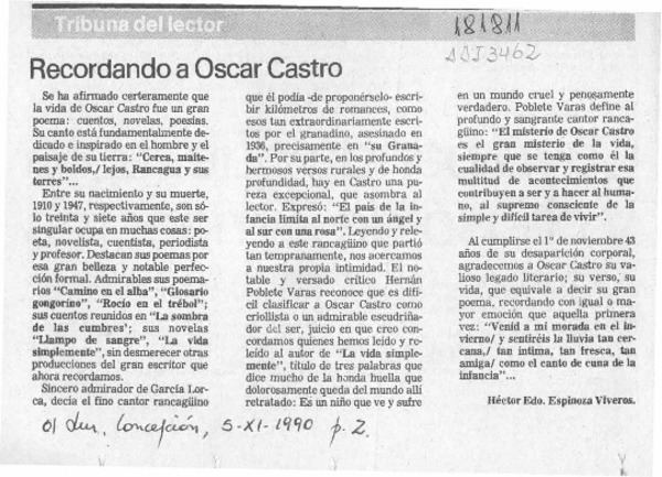 Recordando a Oscar Castro [artículo] Héctor Edo. Espinoza Viveros.