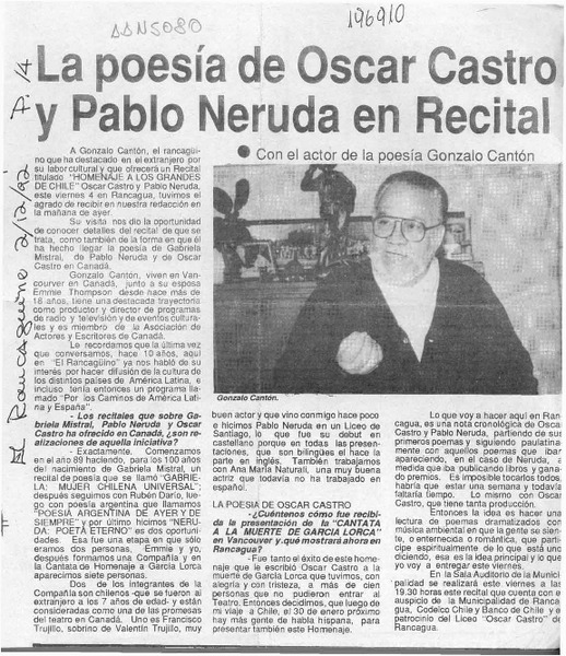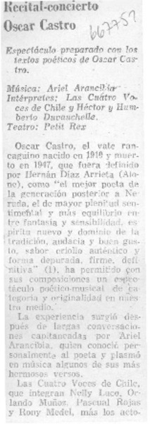 Recital de poesías de Oscar Castro se efectuó. [artículo]