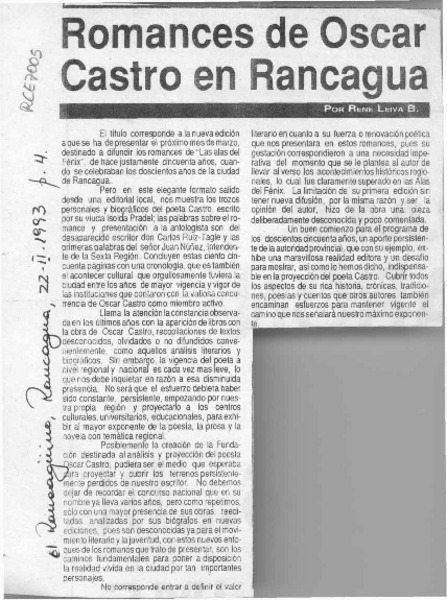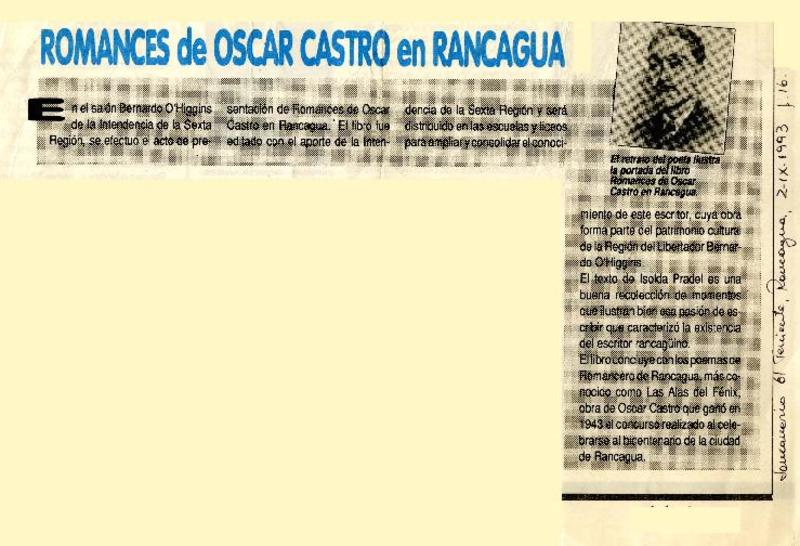 Romances de Oscar Castro en Rancagua [artículo] René Leiva B.