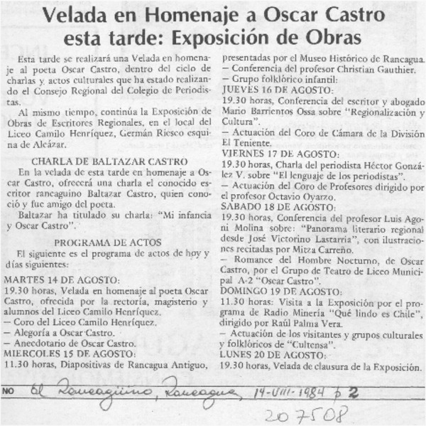 Velada en homenaje a Oscar Castro esta tarde; exposición de obras [artículo].