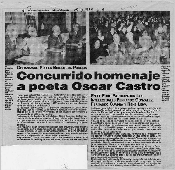 Concurrido homenaje a poeta Oscar Castro [artículo].