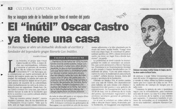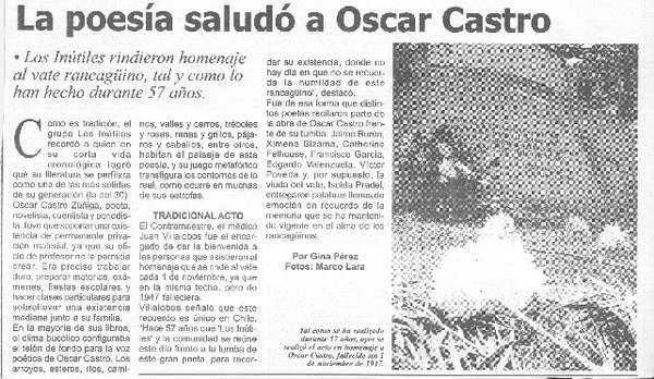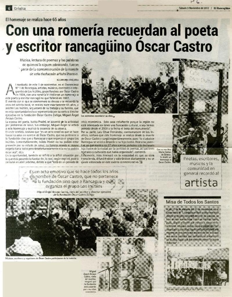 Con una romería recuerdan al poeta y escritor rancagüino Óscar Castro [artículo] Alejandra Conejera.