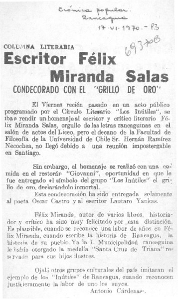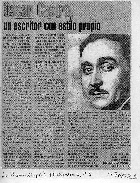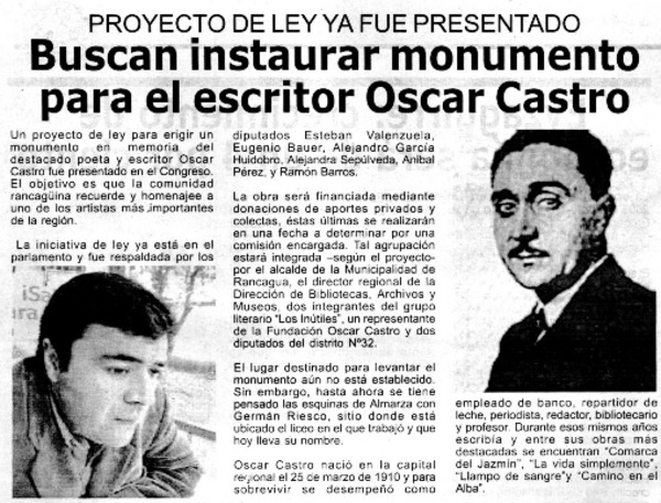 Buscan instaurar monumento para el escritor Oscar Castro. [artículo]