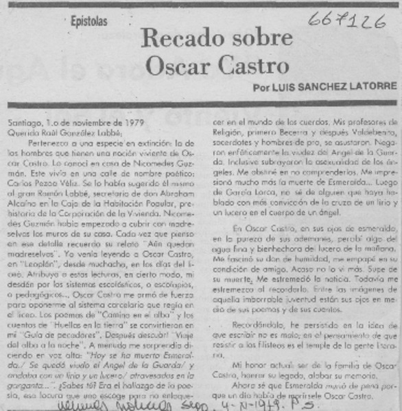 Recado sobre Oscar Castro [artículo] Luis Sánchez Latorre.