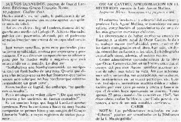 Pradel, Isolda - Dulces chilenos - Blanco, Guillermo - Romances de Óscar Castro - Filosofía de la obra de arte - Castro, Óscar - Cofré, Juan Omar