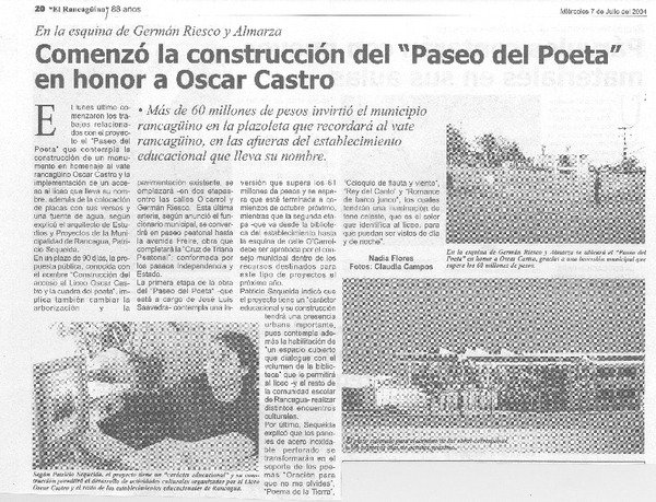 Comenzó la construcción del "Paseo del Poeta" en honoro a Oscar Castro [artículo] Nadia Flores
