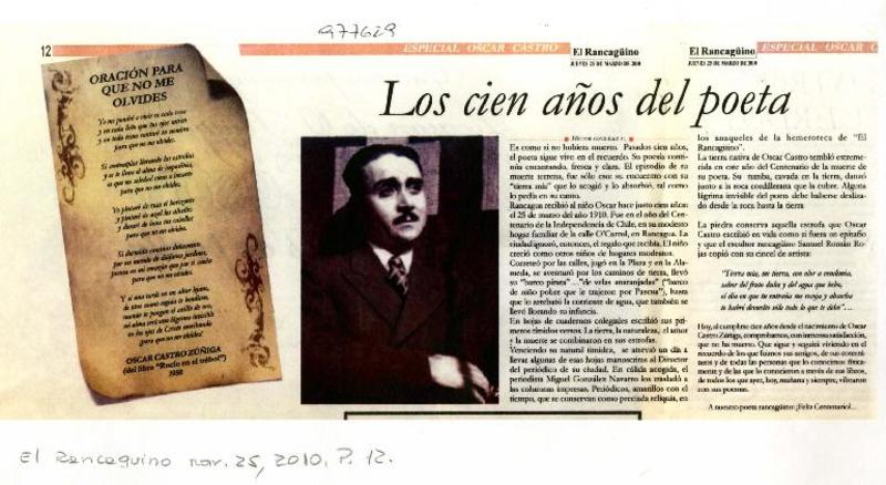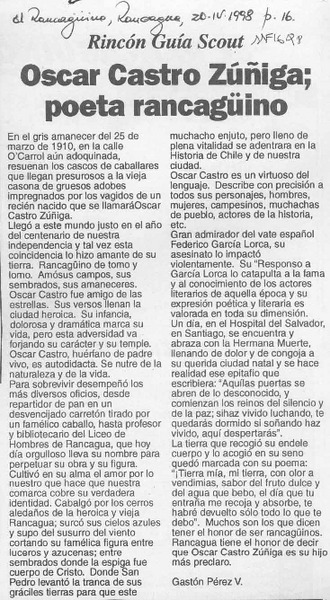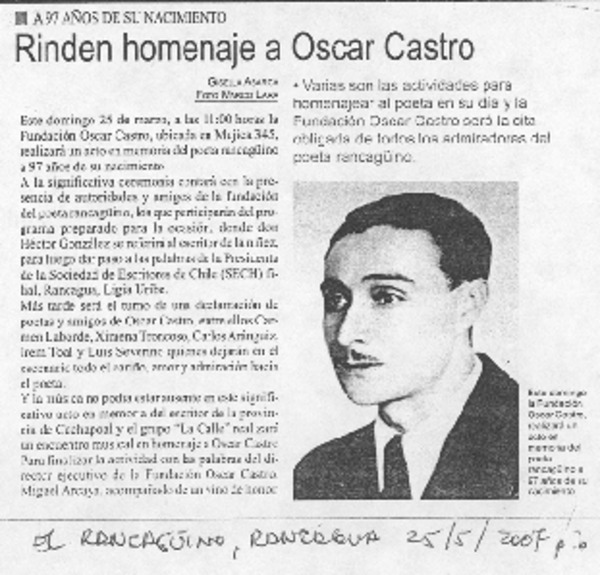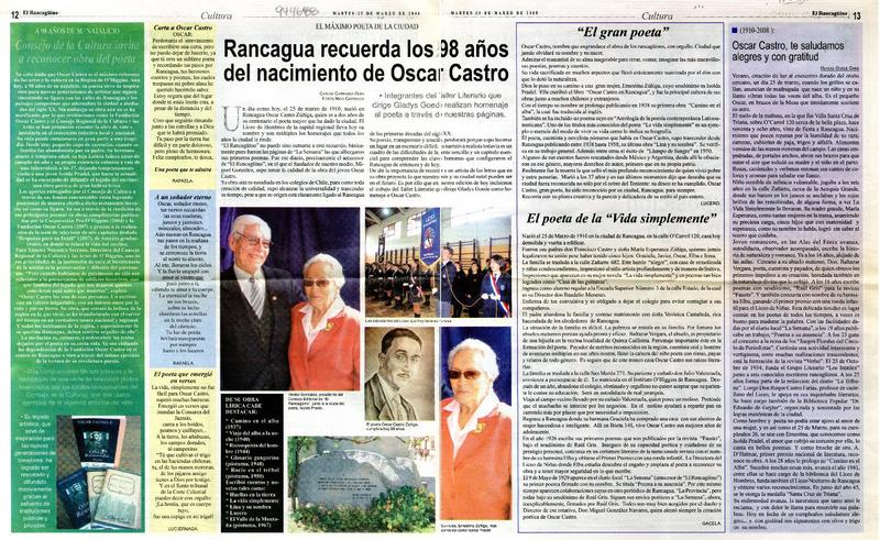 Rancagua recuerda los 98 años del nacimiento de Oscar Castro [artículo] Carlos Carrasco Olea.