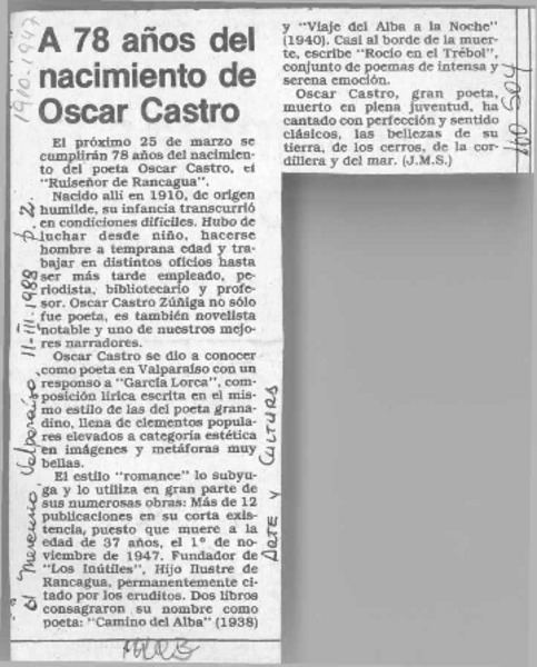 A 78 años del nacimiento de Oscar Castro [artículo] J. M. S.