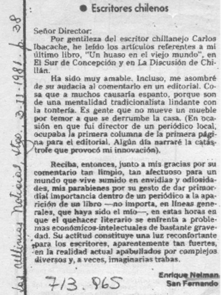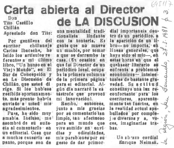 Carta abierta al director de la Discusión [artículo] Enrique Neiman.