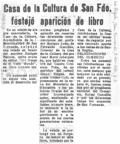 Casa de la cultura de San Fdo. festejó aparición de libro. [artículo]