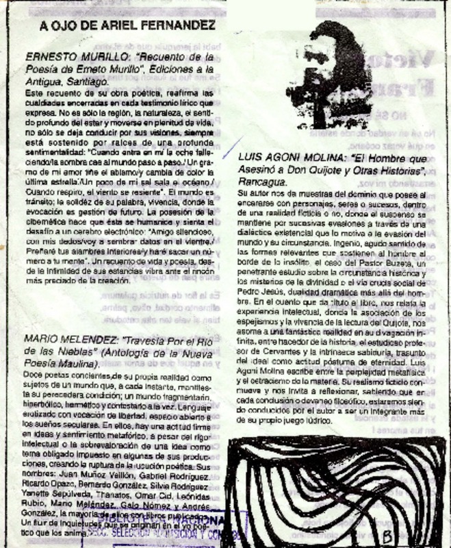 Meléndez, Mario - Recuento de la poesía de Ernesto Murillo - Murillo C., Ernesto - Travesía por el Río de las Nieblas - Agoni Molina, Luis - Autores chilenos - Hombre que asesinó a don Quijote y otras historias