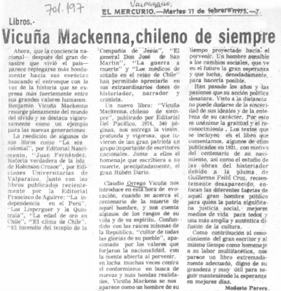 Vicuña Mackenna, chileno de siempre [artículo] Modesto Parera.