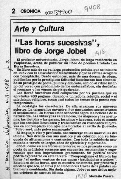 "Las horas sucesivas", libro de Jorge Jobet [artículo] Modesto Parera.