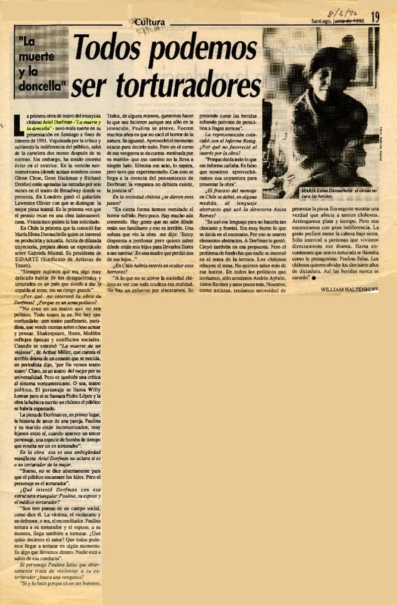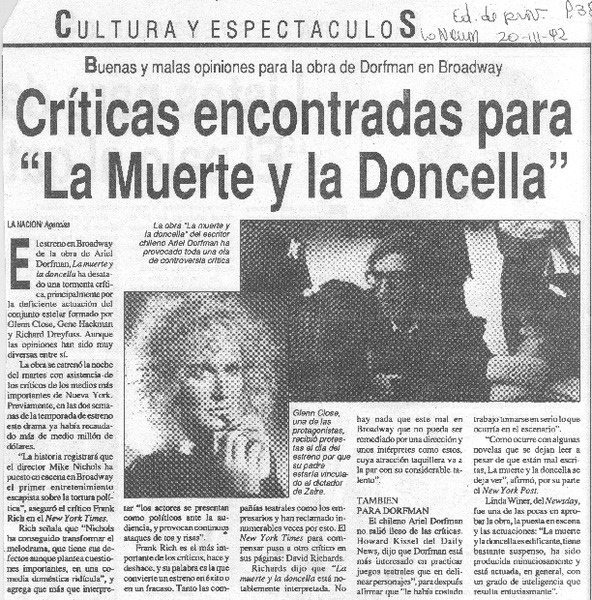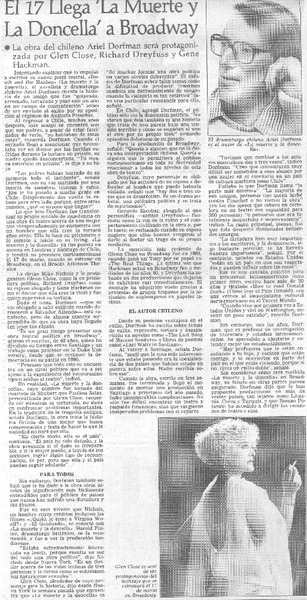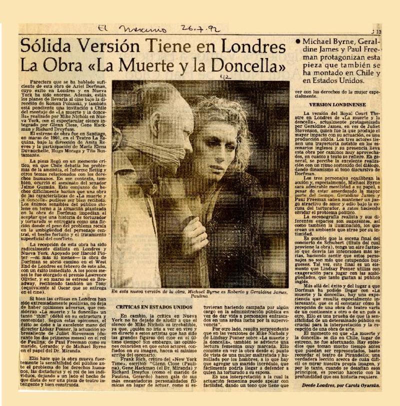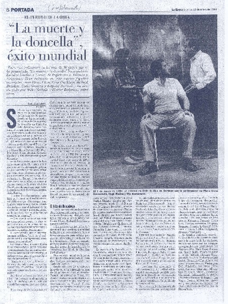 La Muerte y la Doncella dejó a Broadway y partió al mundo [artículo] Eugenio Ahumada.