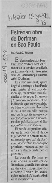 Estrenan obra de Dorfman en Sao Paulo [artículo].