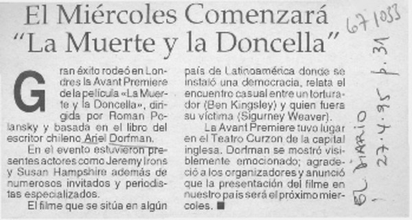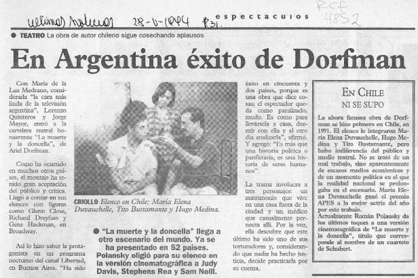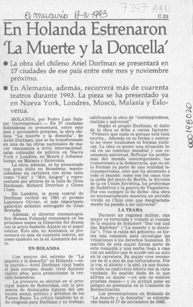 En Holanda estrenaron "La muerte y la doncella" [artículo] Pedro Luis Salazar.