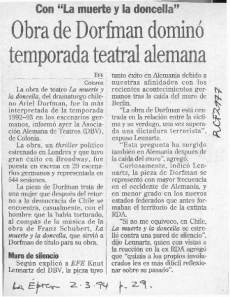Obra de Dorfman dominó temporada teatral alemana [artículo].