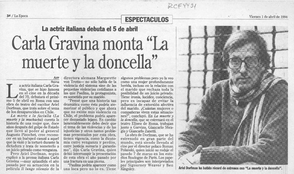 Carla Gravina monta "La muerte y la doncella" [artículo].
