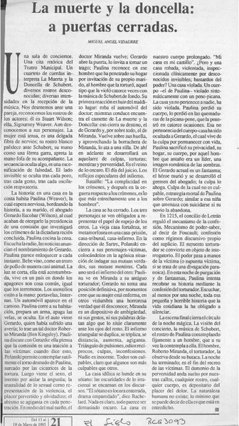 La muerte y la doncella, a puertas cerradas [artículo] Miguel Angel Vidaurre.