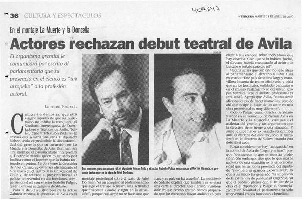 Actores rechazan debut teatral de Avila [artículo] Leopoldo Pulgar I.