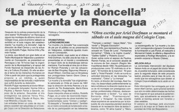 "La Muerte y la doncella" se presenta en Rancagua [artículo]