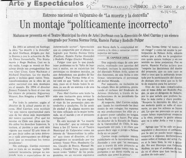 Un elenco estelar protagonizará el texto más famoso de Dorfman [artículo] Eduardo Miranda.