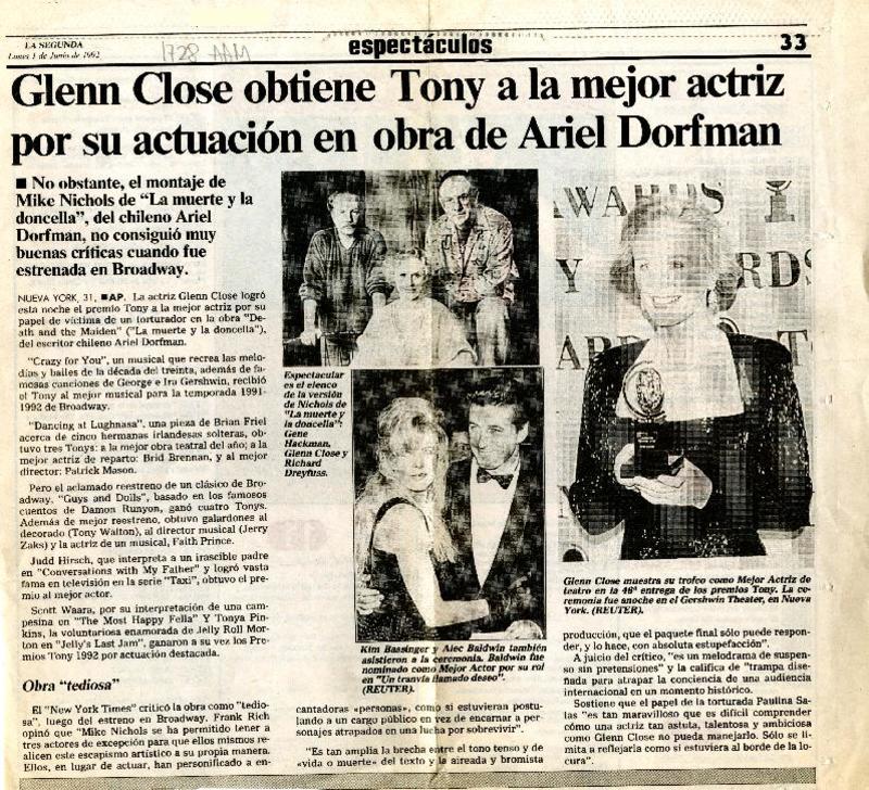 Glenn Close obtiene Tony a la mejor actriz por su actuación en obra de Ariel Dorfman [artículo].