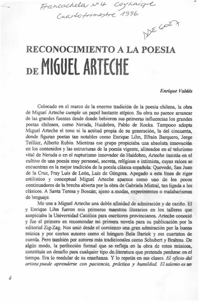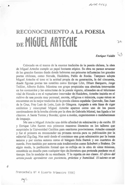Reconocimiento a la poesía de Miguel Arteche [artículo] Enrique Valdés.