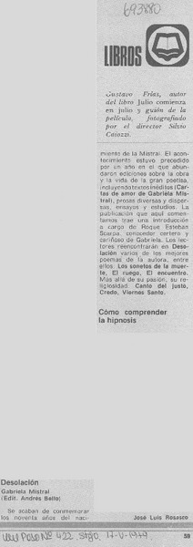Autores chilenos - Mistral, Gabriela - Desolación - Tordman, Gilbert - Cómo comprender la hipnosis