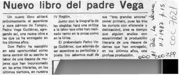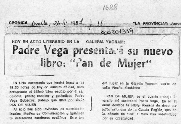 Padre Vega presentará su nuevo libro, "Pan de mujer" [artículo].