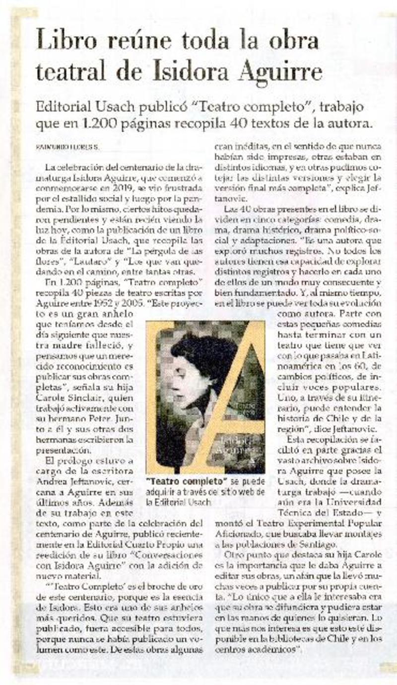 Libro reúne toda la obra teatral de Isidora Aguirre [artículo] Raimundo Flores S.