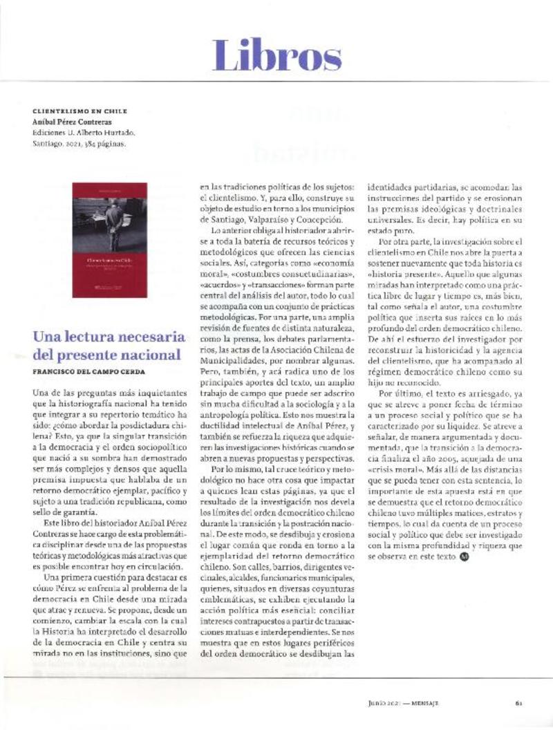 Pérez Contreras, Aníbal - Autores chilenos - Entrevistas - Clientelismo en Chile : historia presente de una costumbre política (1992-2012)