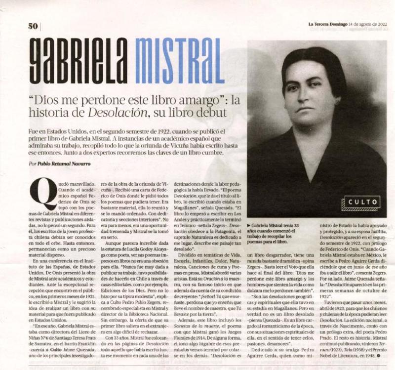 Gabriela Mistral "Dios me perdone este libro amargo" la historia de Desolación, su libro debut[artículo] : Pablo Retamal Navarro.