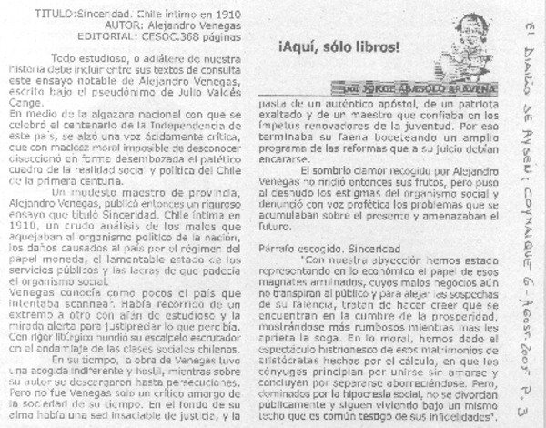 Autores chilenos - Venegas, Alejandro - "Sinceridad"