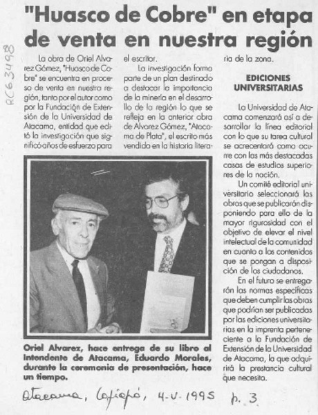 Obsequian fotografía de Jotabeche a escritor copiapino Oriel Alvarez [artículo].