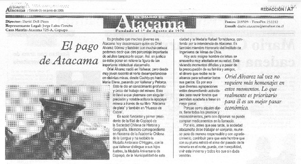 El Historiador Oriel Alvarez deja localidad minera de Chuquicamata [artículo].