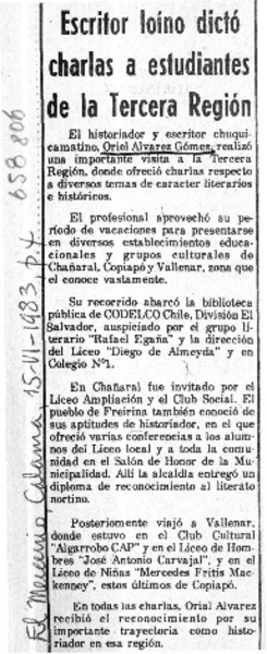 Escritor loíno dictó charlas a estudiantes de la tercera región. [artículo]