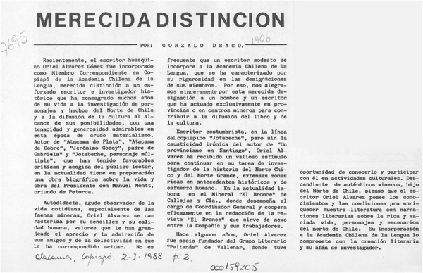 Merecida distinción [artículo] Gonzalo Drago.