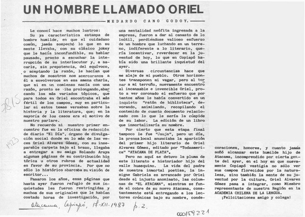 Un hombre llamado Oriel [artículo] Medardo Cano Godoy.