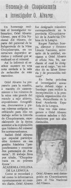 Homenaje de Chuquicamata a investigador O. Alvarez [artículo].