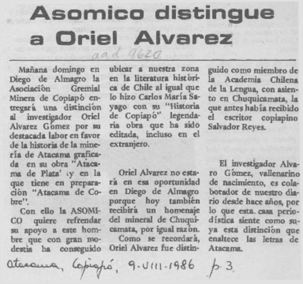 Asomico distingue a Oriel Alvarez [artículo].
