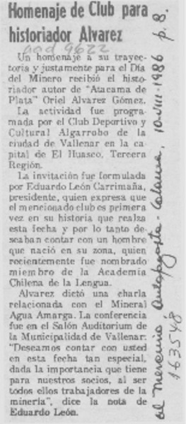 Homenaje de Club para historiador Alvarez [artículo].