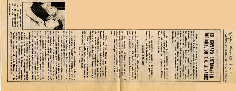 En Copiapó entregarán designación a O. Alvarez [artículo].