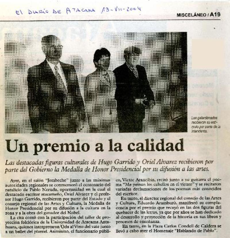 Historiador recibió homenaje en Freirina [artículo] Jorge Zambra.
