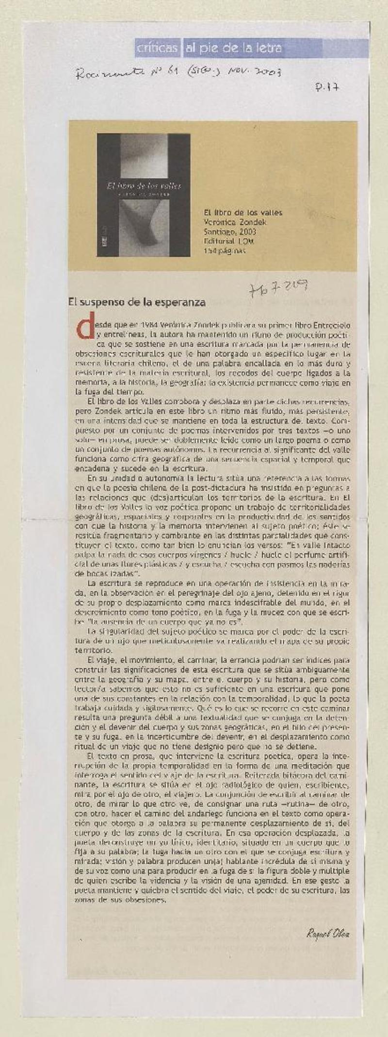 El suspenso de la esperanza [artículo] Raquel Olea.