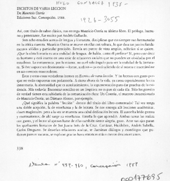 Un nuevo libro de González-Urízar [artículo] Hugo Montes Brunet.