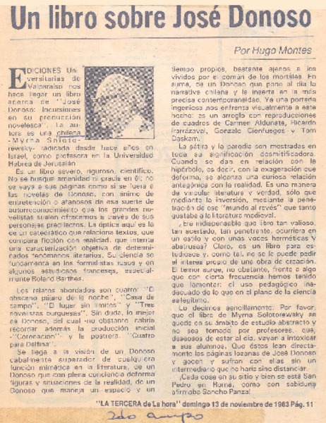 Un libro sobre José Donoso [artículo] Hugo Montes.
