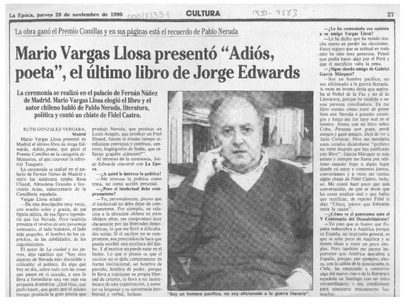Mario Vargas Llosa presentó "Adiós, poeta", el último libro de Jorge Edwards [artículo] Ruth González-Vergara.