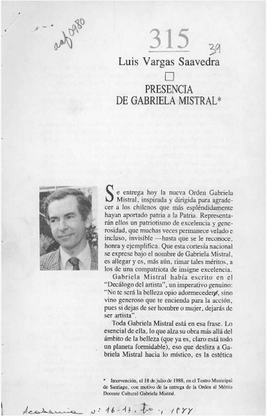 Presencia de Gabriela Mistral [artículo] Luis Vargas Saavedra.