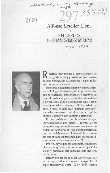 Recuerdos de Juan Gómez Millas [artículo] Alfonso Letelier Llona.